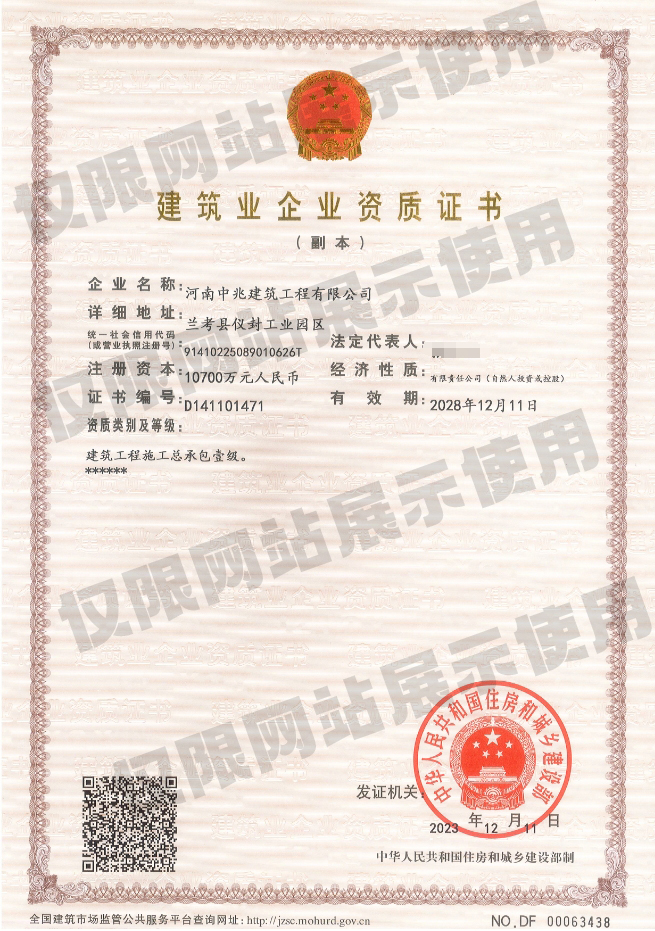 • 河南中兆建筑工程有限公司成立于2013年,公司注冊(cè)資本10700萬(wàn)元,凈資產(chǎn)總額近1.9億元。公司目前具有“建筑工程、市政公用工程、鋼結(jié)構(gòu)工程、建筑機(jī)電安裝工程、建筑裝修裝飾工程、地基與基礎(chǔ)工程、消防設(shè)施工程、壓力管道”等17個(gè)資質(zhì)。現(xiàn)有從業(yè)人員2150人,具有中高級(jí)各類專業(yè)技術(shù)職稱管理人員達(dá)120人,壹級(jí)、貳級(jí)建造師約90余人;主要施工設(shè)備300多臺(tái)(套)。通過(guò)了ISO9001質(zhì)量管理體系認(rèn)證、職業(yè)健康安全管理體系認(rèn)證、環(huán)境管理體系認(rèn)證,并多次獲得省級(jí)“AAA”信用企業(yè)、“重合同守信用”、“先進(jìn)建筑企業(yè)...